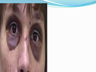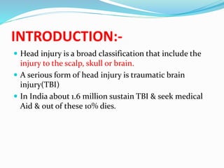 This document provides information on head injuries including traumatic brain injury. It discusses the types of head injuries such as scalp lacerations, skull fractures, and various types of brain injuries including concussions, contusions, diffuse axonal injuries, and intracranial hemorrhages. The etiology, signs and symptoms, diagnosis, management including surgery if needed, and nursing care are described for different head injury types.