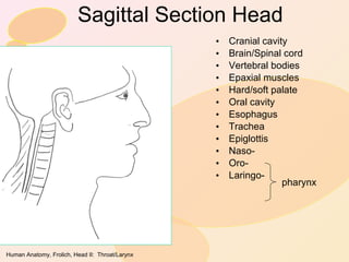 This document provides an overview of the structures and functions of the head and neck region, including the nose, mouth, throat, and larynx. It describes the role of the nasal cavity in warming and filtering air during breathing. It details the components of the mouth like lips, cheeks, palate, and jaws and their functions in chewing and forming words. It outlines the process of swallowing from the mouth through the pharynx and protection of the airway by the epiglottis. It also reviews the larynx and its role in vocalization and respiration.