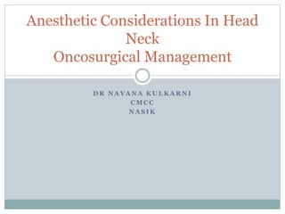 The document outlines the anesthetic considerations and peri-operative management for patients undergoing head and neck cancer surgeries. It highlights the epidemiology of head and neck cancers, risk factors, anesthetic management strategies, and specific challenges associated with airway management in these patients. Additionally, it discusses the implications of age, cancer treatment, and preoperative evaluations on surgical outcomes.