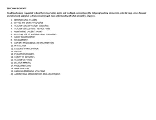 This document outlines a teaching practice observation form used by the Universidad Autónoma de Chiapas Escuela de Lenguas in Tapachula, Mexico. The form includes sections for objective technical aspects, teaching elements, observation, and feedback. It lists 20 teaching elements that observers are asked to base their feedback on, such as lesson design, setting objectives, use of target language, monitoring understanding, use of materials, group arrangement, management, and student participation.