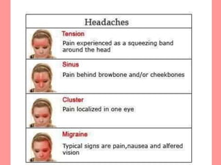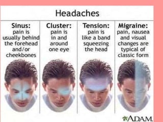 Headaches can have many causes and present with varying symptoms. Primary headaches include tension, cluster, and migraine headaches which originate from structures surrounding the brain. Secondary headaches are caused by underlying conditions and can be life-threatening. A thorough history and physical exam is important to determine the type and cause of headache and appropriate treatment.