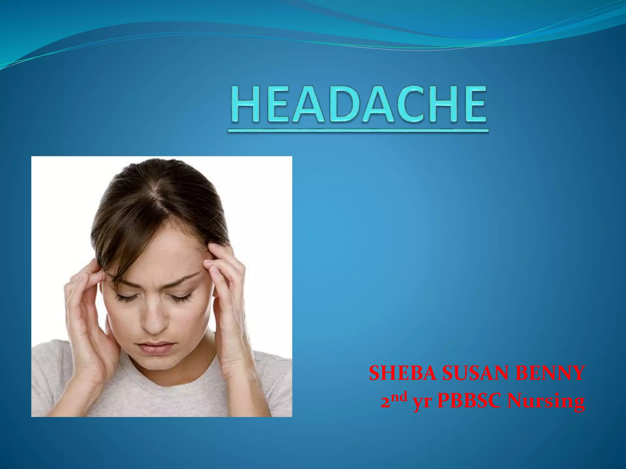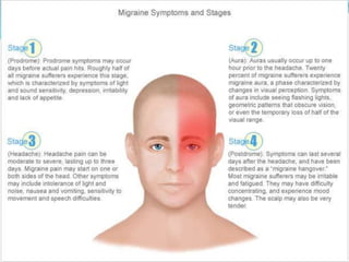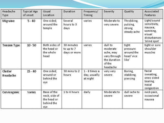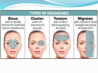 - Headaches can be primary (e.g. migraines, tension-type) or secondary due to other causes like head trauma.