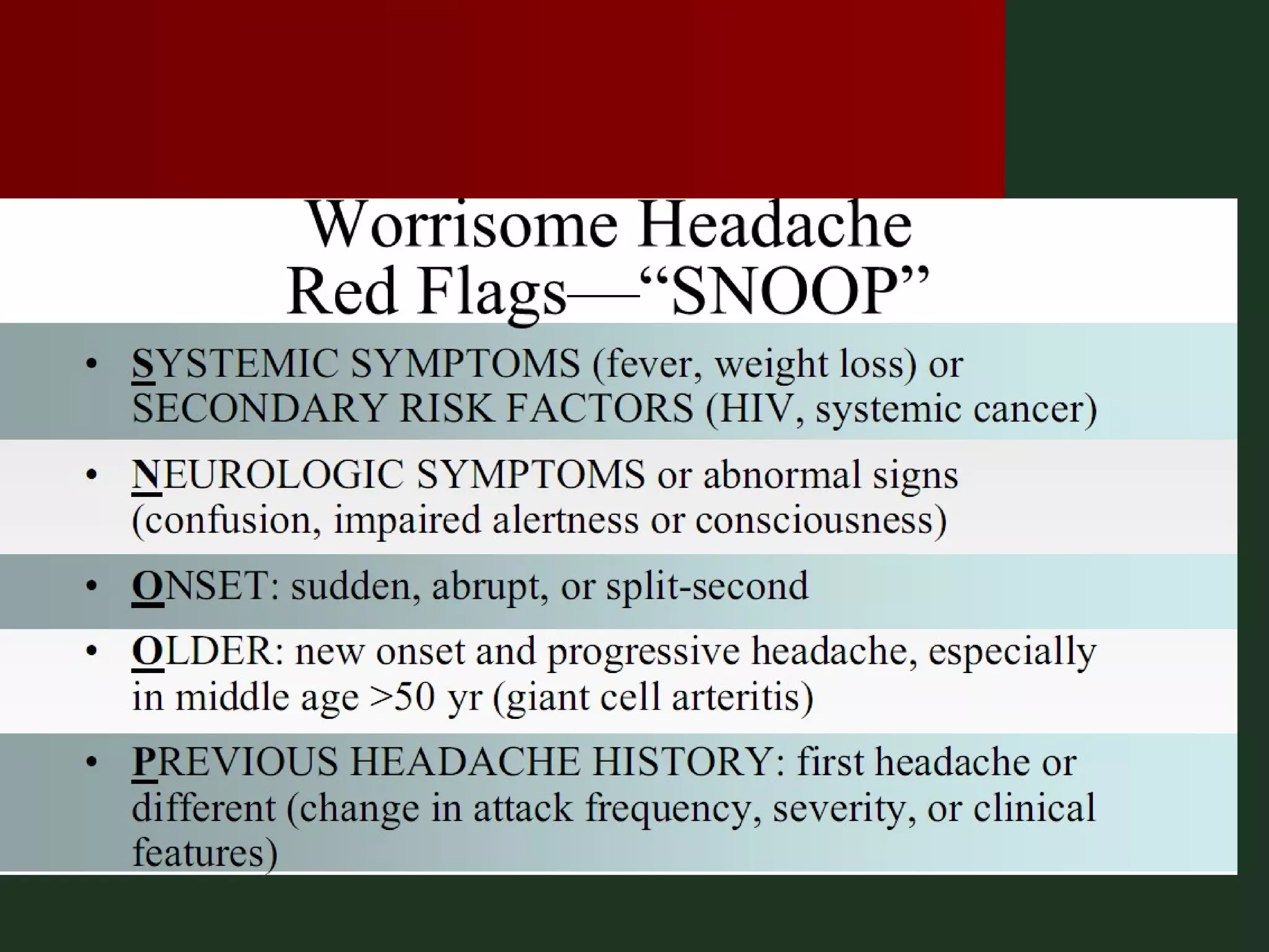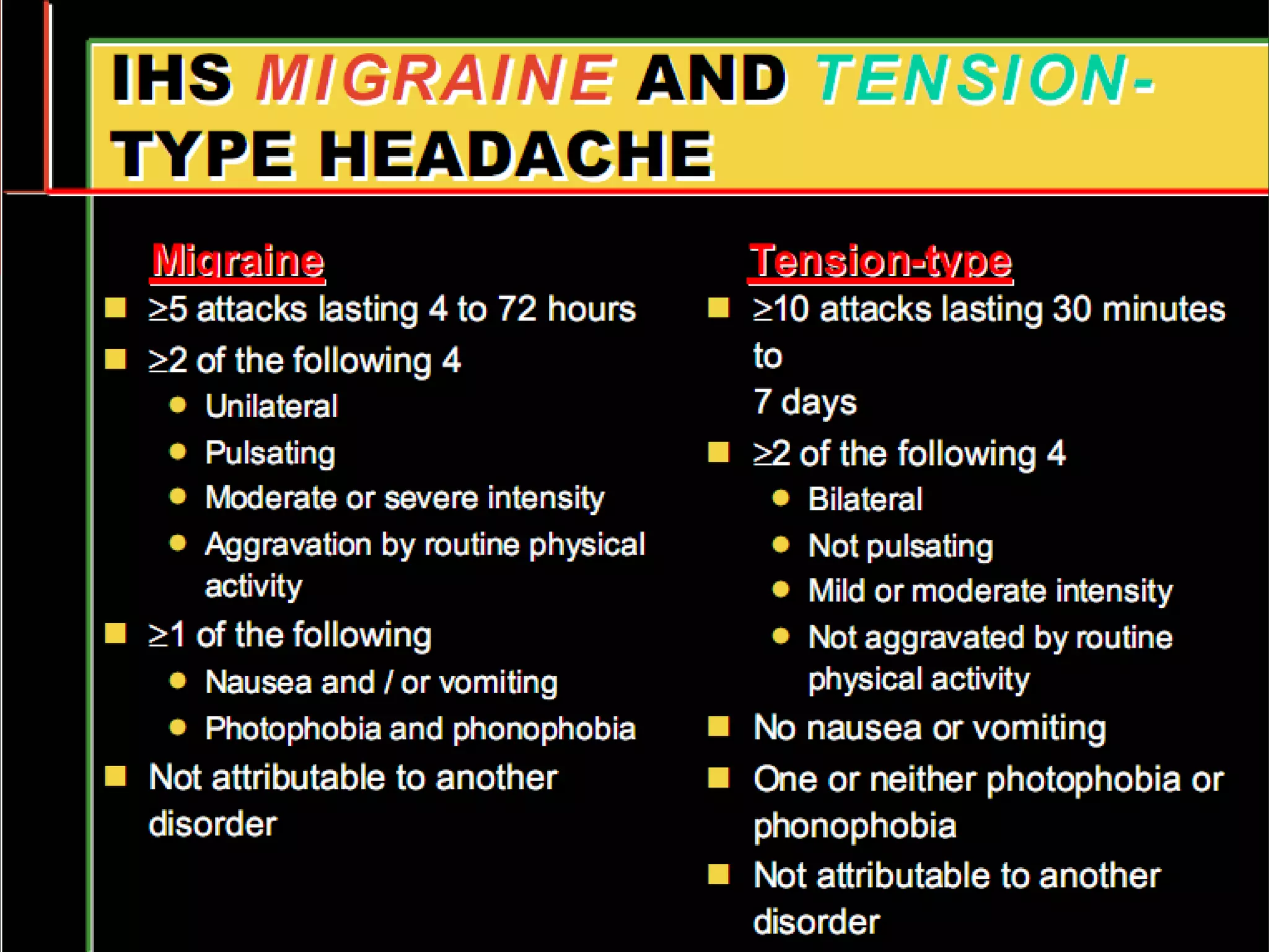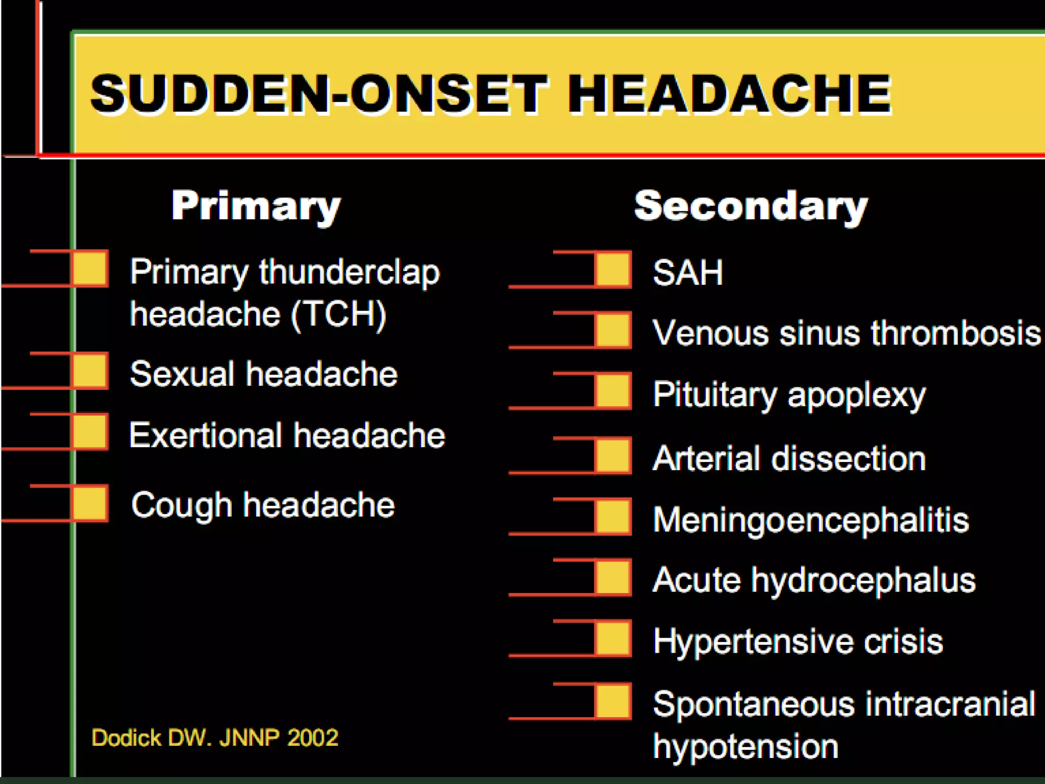 This document provides an overview of common headache types and considerations for their evaluation and diagnosis. It discusses key factors such as duration, location, and aggravating/relieving factors that can help determine the underlying cause. Primary headache types like migraine, tension, and cluster headaches are described. Red flags indicating potential serious conditions are outlined. Secondary headache etiologies like tumors, meningitis, and subarachnoid hemorrhage are also reviewed.