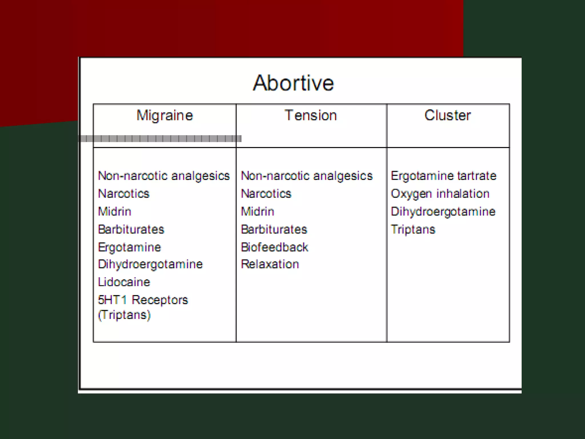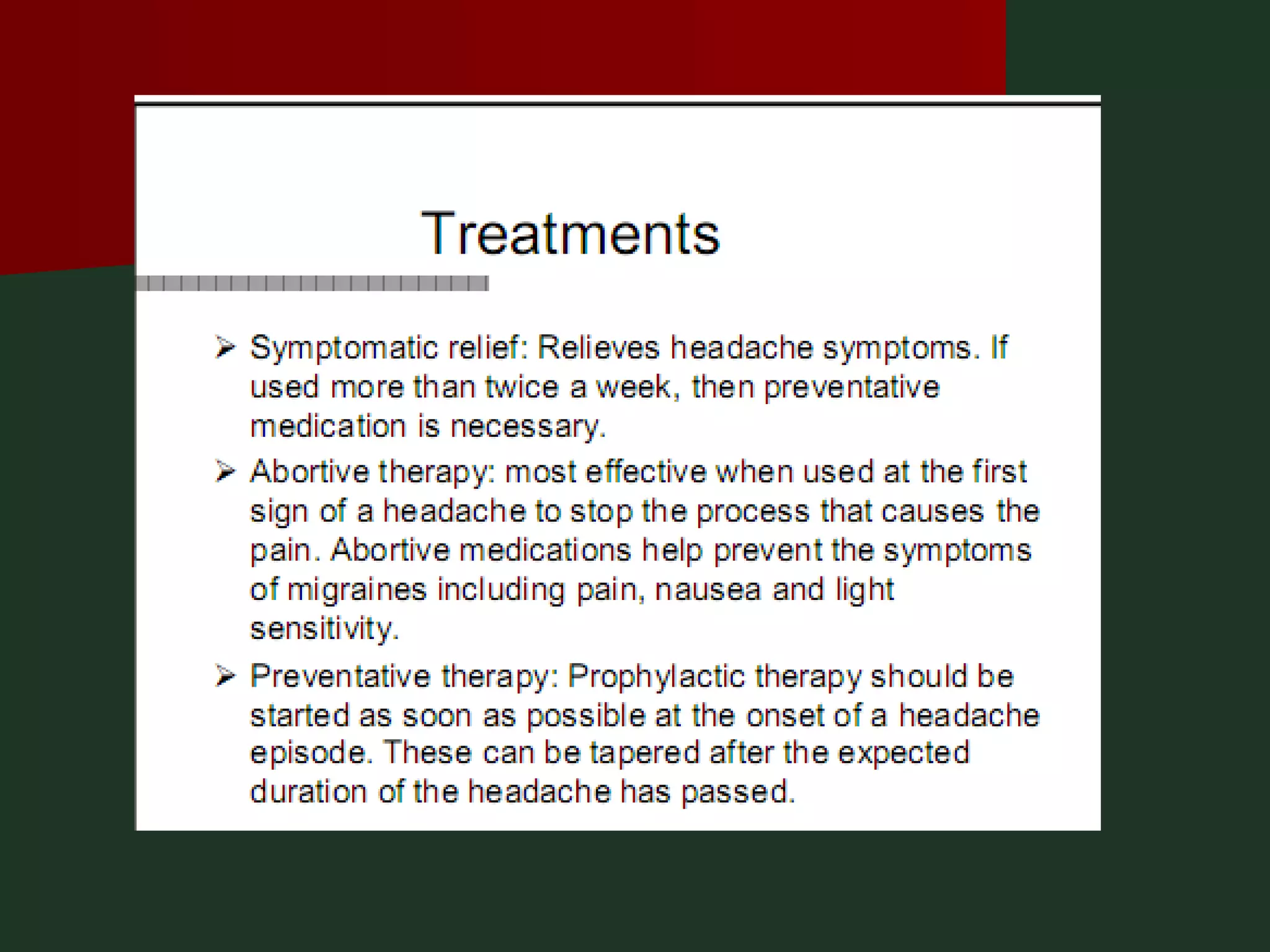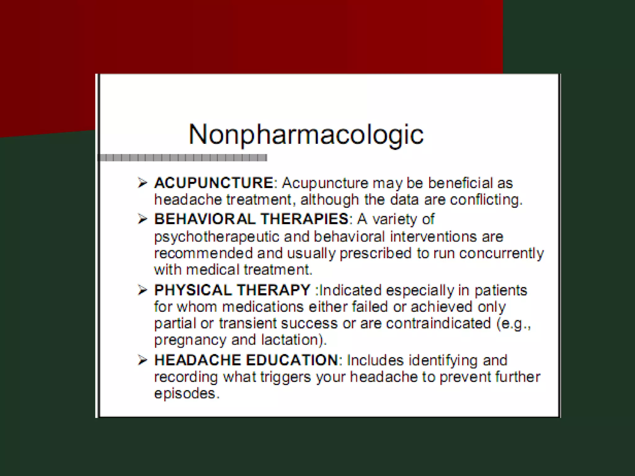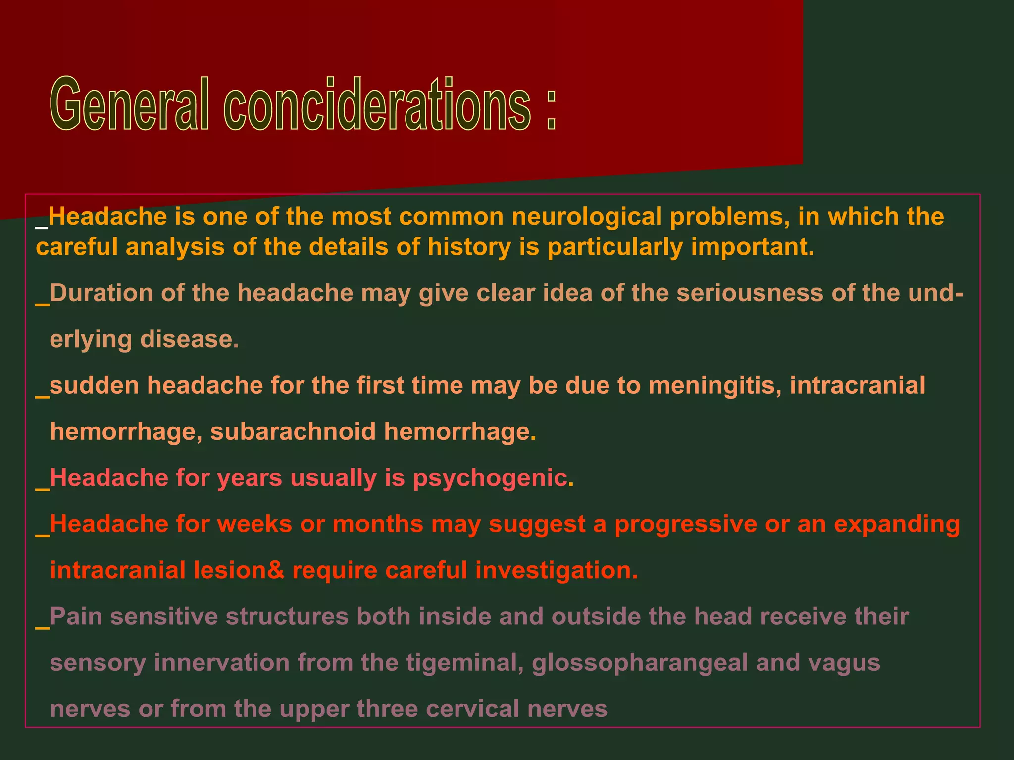 This document provides an overview of common headache types and considerations for their evaluation and diagnosis. It discusses key factors such as duration, location, and aggravating/relieving factors that can help determine the underlying cause. Primary headache types like migraine, tension, and cluster headaches are described. Red flags indicating potential serious conditions are outlined. Secondary headache etiologies like tumors, meningitis, and subarachnoid hemorrhage are also reviewed.