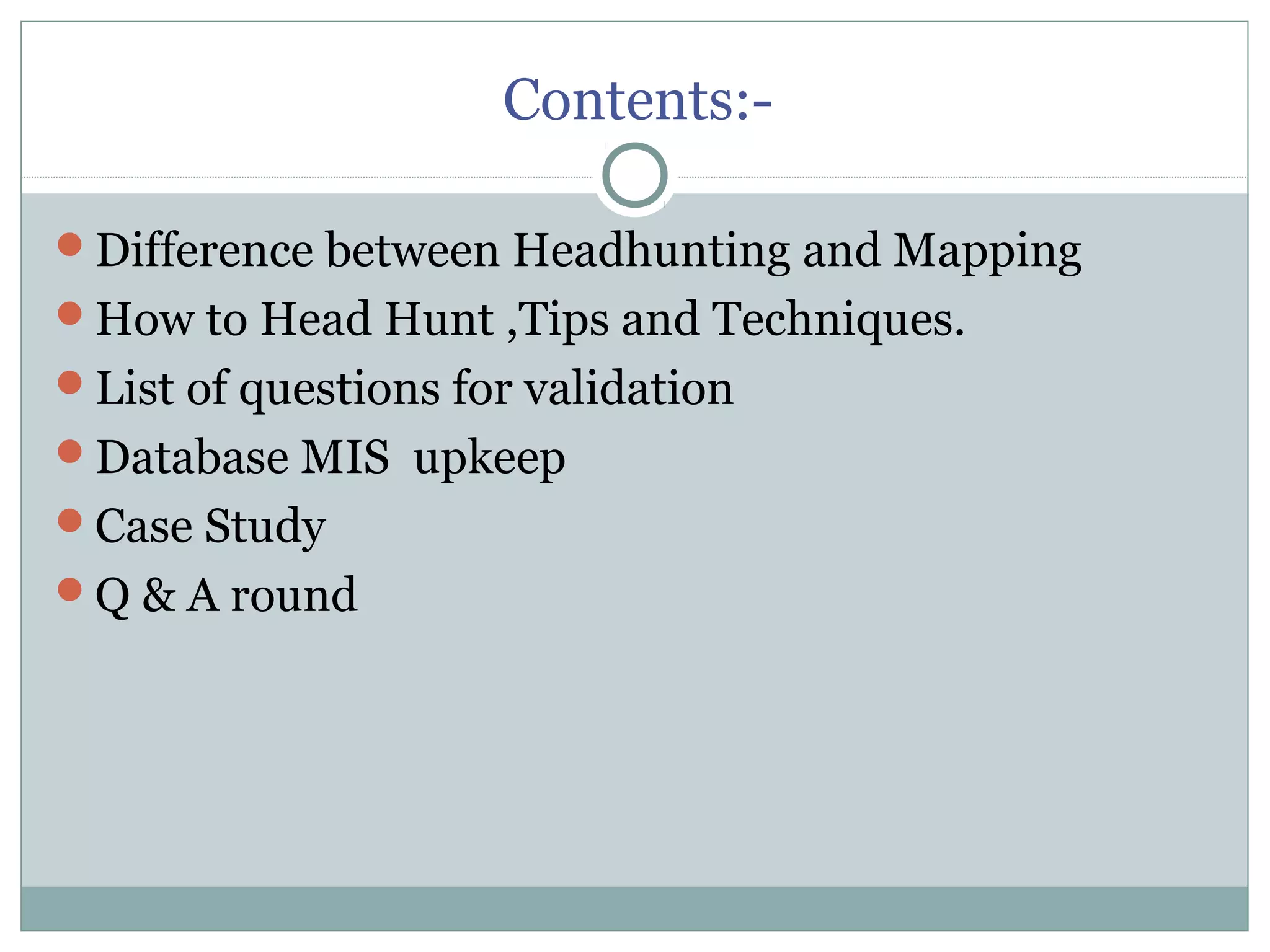 This document provides tips and techniques for headhunting and mapping potential job candidates. It discusses the difference between headhunting and mapping, with headhunting referring to the recruitment of executive personnel and mapping referring to scanning an organization's structure. The document then gives numerous strategies and tricks for headhunting, such as researching companies, using scripts to reach the right departments, and gathering information from current employees. It also provides a list of questions to validate candidates and advice for maintaining records in a database.