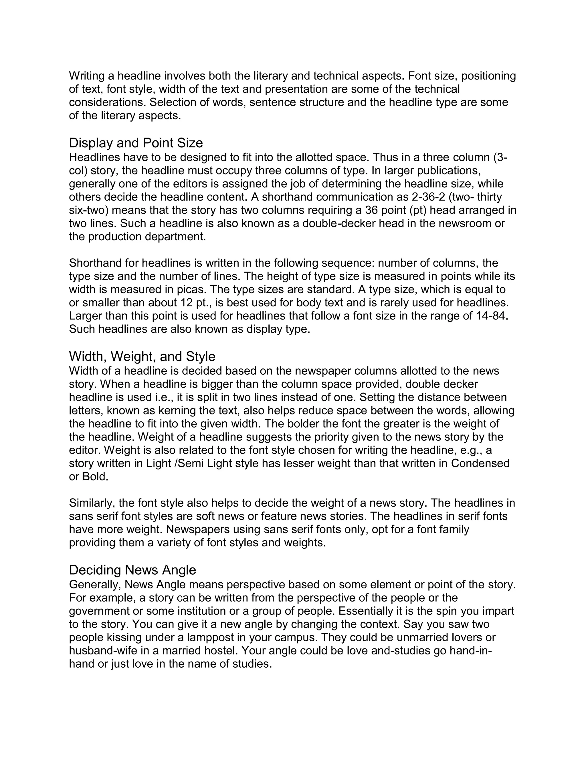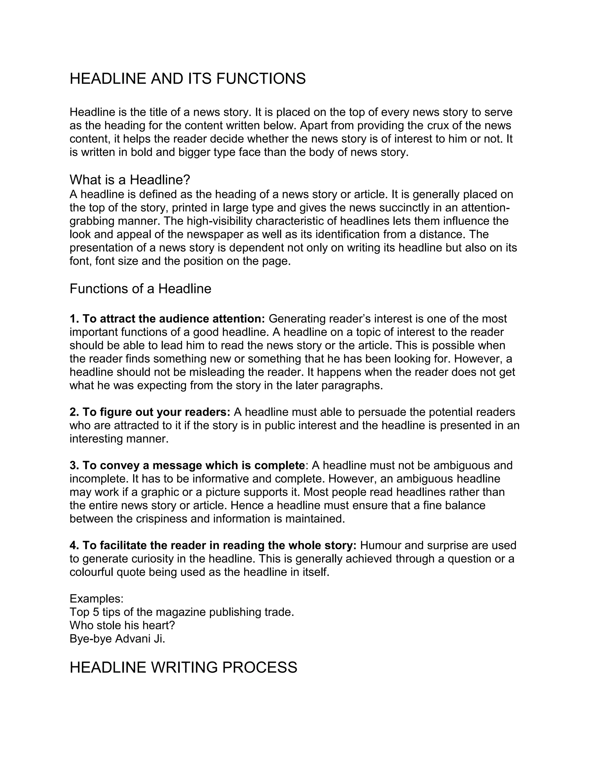 This document discusses the functions and types of headlines used in news stories. Headlines serve to attract readers' attention, convey the key message or crux of the news in a concise manner, and encourage readers to read further. There are several types of headlines including descriptive, comment, quotation, question, and label headlines. Headlines are crafted considering both literary aspects like word choice and technical aspects like font size and style. Additional supporting headlines called props can also be used, positioned above or below the main headline, to highlight additional important points from the news story.