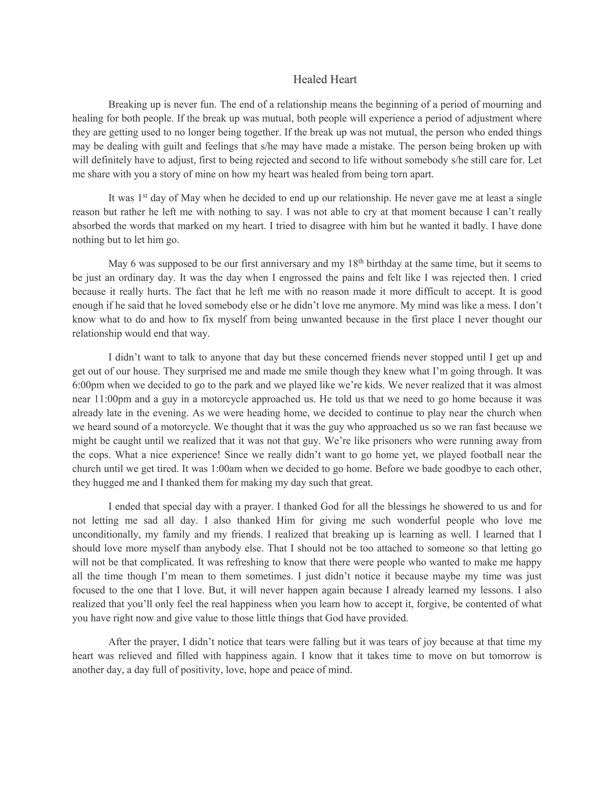 Breaking up is difficult and requires a period of mourning and adjustment. The author describes their own experience with a break up, where their boyfriend ended the relationship without explanation, which was especially hard on their birthday. Their friends supported them by taking their mind off the break up with games and laughter late into the night. The author realized that while it will take time, surrounding oneself with friends and focusing on self-love can help heal a broken heart.
