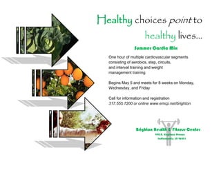 This document advertises a summer cardio mix program at the Brighton Health & Fitness Center that meets for one hour, three times a week for eight weeks starting on May 5. It includes aerobics, step, circuits, interval training and weight management training. Interested participants can call or register online for more information.