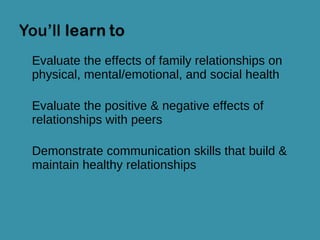 Families provide physical, emotional, and social support that contributes to overall health and well-being. Peer relationships can have both positive and negative influences through peer pressure, which influences adolescents to conform or take risks. Developing communication skills like active listening and expressing feelings appropriately helps build and maintain healthy relationships.