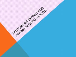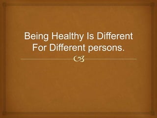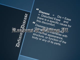 The document discusses the concept of health, defining it as a state of well-being that encompasses physical, mental, and social aspects. It highlights the significance of good health in enhancing work efficiency, societal progress, and individual potential, along with the essential conditions for being free of disease. Additionally, it categorizes various types of diseases, including infectious and deficiency diseases, and their causes.