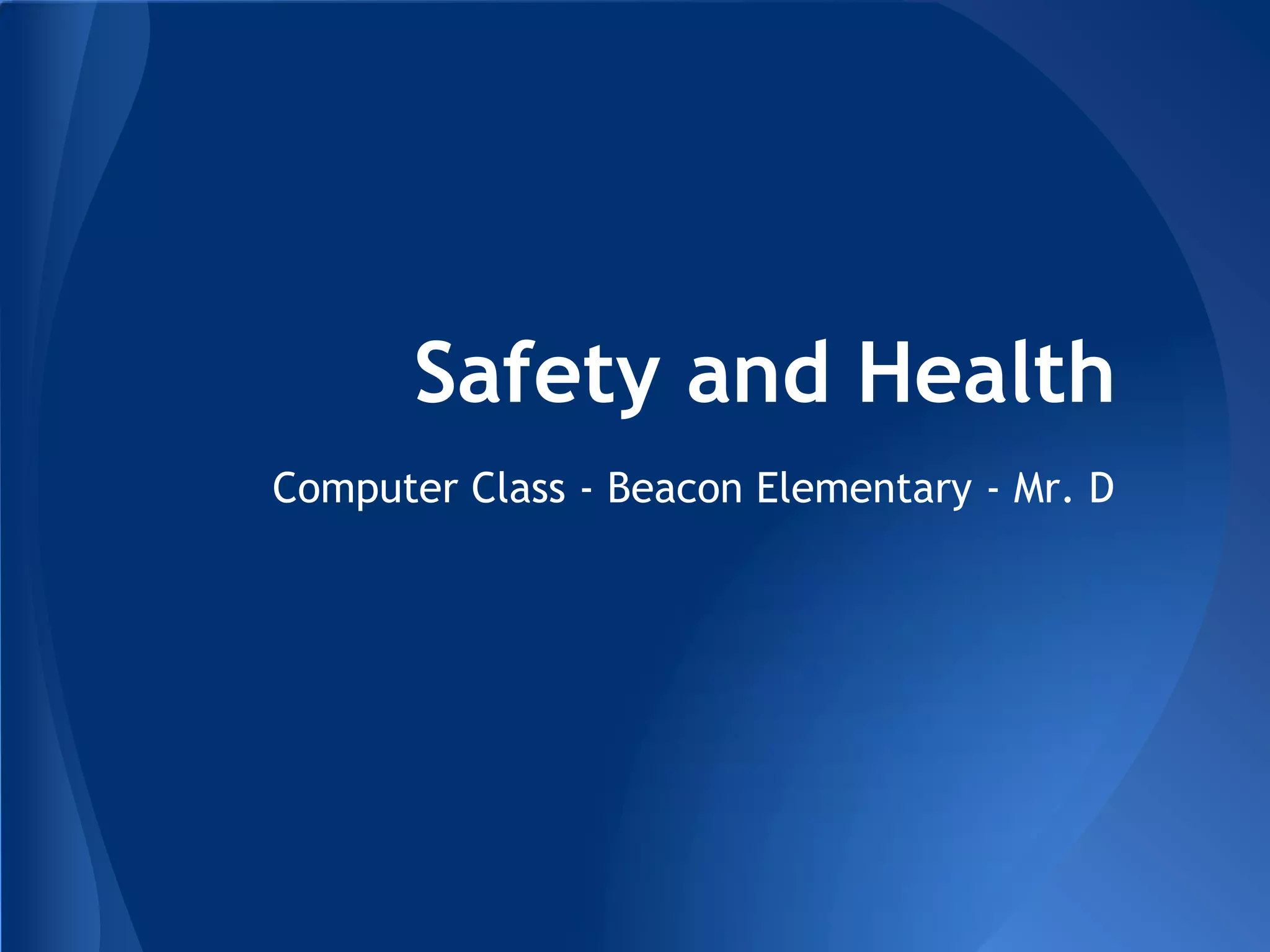 The document provides guidelines for kids' health and safety when using computers. It recommends taking regular breaks according to the 20-20-20 rule of looking away every 20 minutes. Proper posture is important to avoid injuries, including keeping the back straight against the chair, shoulders relaxed, and computer at a comfortable distance. Users should keep their arms bent at 90 degrees and feet on the floor.