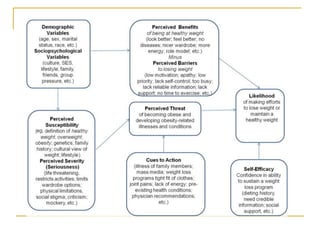 2) The Health Belief Model includes perceived susceptibility, severity, benefits, and barriers in predicting preventive health behaviors. Perceived barriers are the strongest predictor.