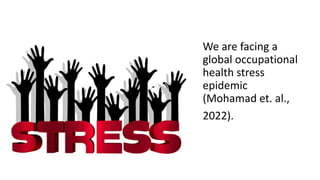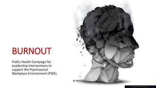 The document discusses burnout as a global occupational health issue impacting individuals and organizations. It emphasizes that leadership interventions are needed to support employee stress management and improve the psychosocial workplace environment. Effective leadership can help prevent burnout by addressing job demands, providing resources to manage stress, and role modeling positive health behaviors. Interventions focused on these areas may help lower disease prevalence and increase productivity, mental health, and worker well-being.