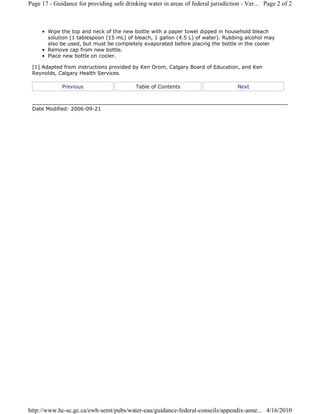 This document provides instructions for maintaining a bottled water dispenser. It outlines steps for cleaning the stainless steel reservoir with a bleach or vinegar solution, draining and rinsing it thoroughly. It also describes cleaning the drip tray and screen, and disinfecting new water bottles with bleach or rubbing alcohol before replacing the empty bottle. Proper hand washing is emphasized.