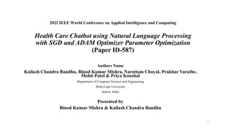 This document describes a health care chatbot developed using natural language processing. The chatbot was created to provide medical information and assistance to patients, especially in emergency situations. The authors used techniques like tokenization, stop word removal, and word similarity analysis. They tested different learning rates and optimizers (SGD, Adam) and found Adam with a learning rate of 0.0099 produced the best results with 93% accuracy. The chatbot was implemented in Python using common NLP libraries and could help address issues like limited doctor availability.