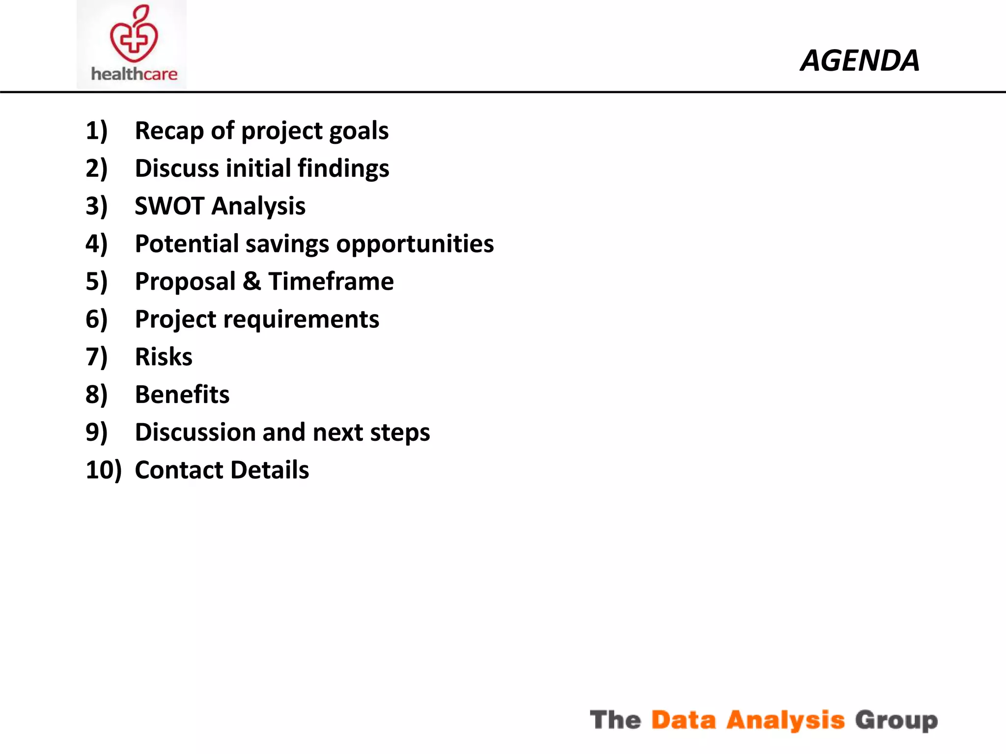The document outlines a proposed project to achieve cost reductions through advanced data analytics in a healthcare setting, focusing on optimizing operations and improving patient care. It includes an analysis of current data sources, skills, and systems, as well as identified potential savings opportunities and a structured approach for implementation. Key components involve stakeholder engagement, risk management, and the establishment of a pilot project to explore high-yielding savings opportunities.