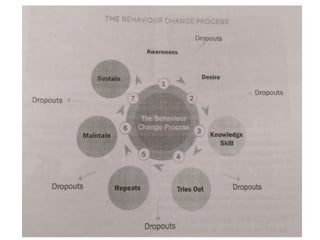 This document provides an overview of health communication, including its definition, process, functions, types, barriers, and methods. It defines communication as the transfer of information between people to develop understanding. The communication process involves a sender encoding a message, the message being transmitted through a media or channel, and received by an audience who provides feedback. Key points covered include the roles of sender, message, media, and audience. It also discusses different types of communication, barriers to communication, qualities of good communicators, and methods used in health communication such as IEC, BCC, SBCC, and counseling.