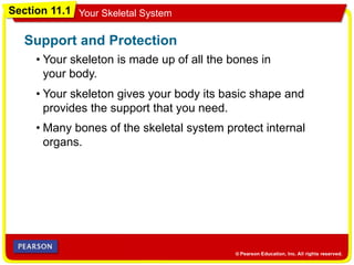 The document provides information about the skeletal, muscular, and nervous systems. It discusses the key roles and functions of the skeletal system, including support, protection, movement, storage, and production of materials. It describes the types of bones, joints, and development of bones. It also covers how to keep the skeletal system healthy through diet, exercise, and avoiding injuries. For the muscular system, it discusses the types of muscles, how muscles work in pairs to facilitate movement, and maintaining muscle health through exercise. Finally, it outlines the basic functions and components of neurons and the nervous system, including the different types of neurons.