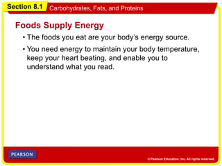 The document discusses nutrients and how they provide energy for the body. There are six classes of nutrients: carbohydrates, fats, proteins, vitamins, minerals, and water. These nutrients are obtained from food and undergo metabolism, releasing energy that the body uses for functions like growth and tissue repair. Proper nutrition requires obtaining a variety of nutrients from foods while balancing intake with physical activity.