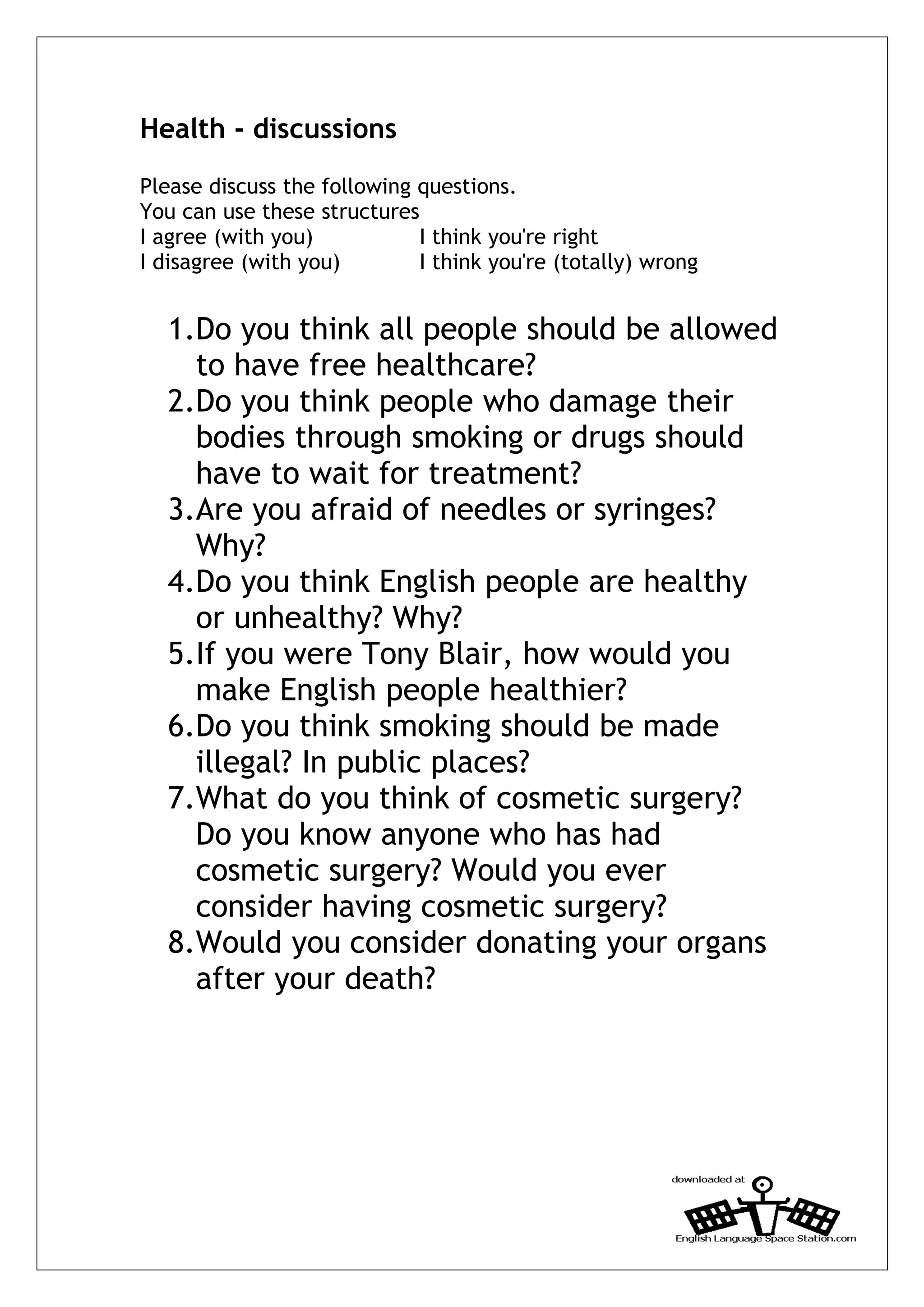 The document discusses several questions about health, including whether healthcare should be free for all, if smokers or drug users should wait for treatment, fears of needles, the health of English people, ways to improve public health as a leader, banning smoking in public, thoughts on cosmetic surgery, and organ donation after death.