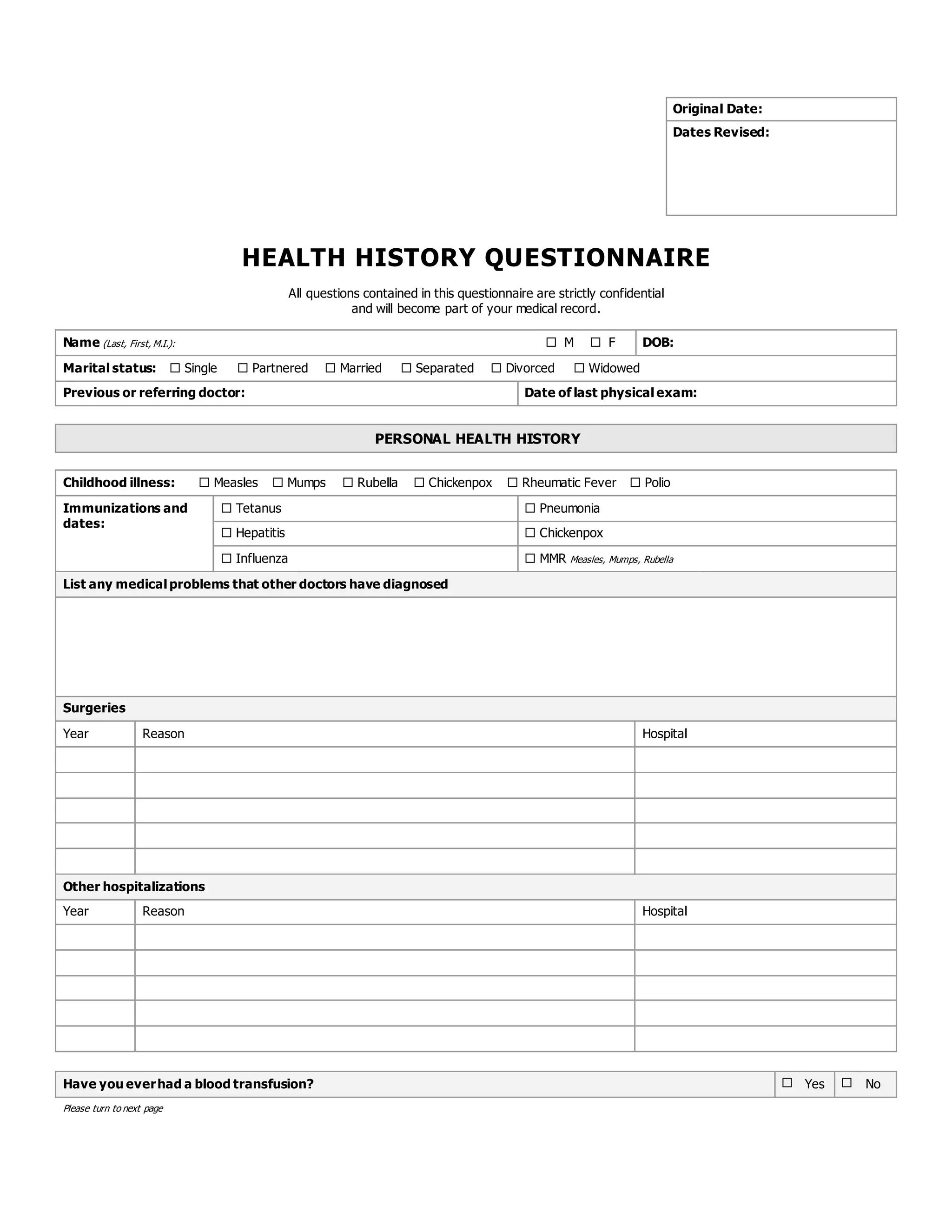 This document contains a health history questionnaire that collects personal and family medical history information. It asks about childhood illnesses, surgeries, medications, allergies, health habits like exercise, diet, alcohol and tobacco use, as well as mental health, women's health, and men's health questions. The questionnaire is confidential and will become part of the patient's medical record.