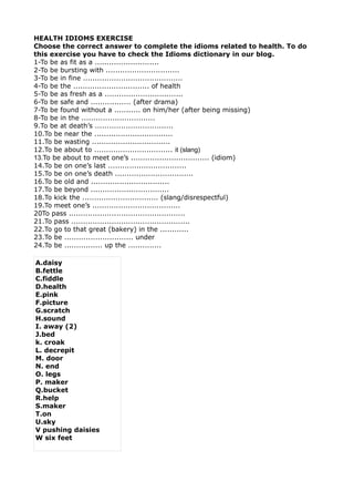 The document provides a health idioms exercise where the reader must choose the correct word to complete each idiom from a list of options. There are 24 idioms related to health, fitness and the human body that the reader must fill in the blank for. The idioms cover a range of topics including levels of health, recovery from illness or injury, aging, and death.