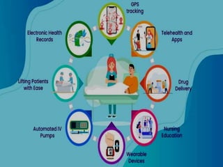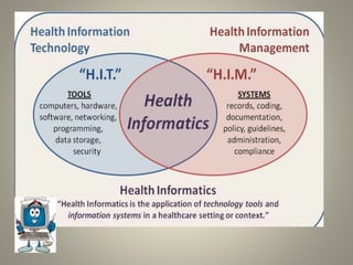 Nursing informatics combines nursing science, computer science, and information science to manage and communicate data, helping to develop more efficient healthcare processes and provide high-quality patient care. It requires the use of information technology to collect evidence-based research, develop skills to use electronic medical records, create health policies through data collection, and facilitate interdisciplinary communication using technologies like telehealth. Effectively using data can improve patient care through more accurate diagnosis, engagement, and predictive analytics, as well as administrative functions like revenue management, appointments, and staffing.