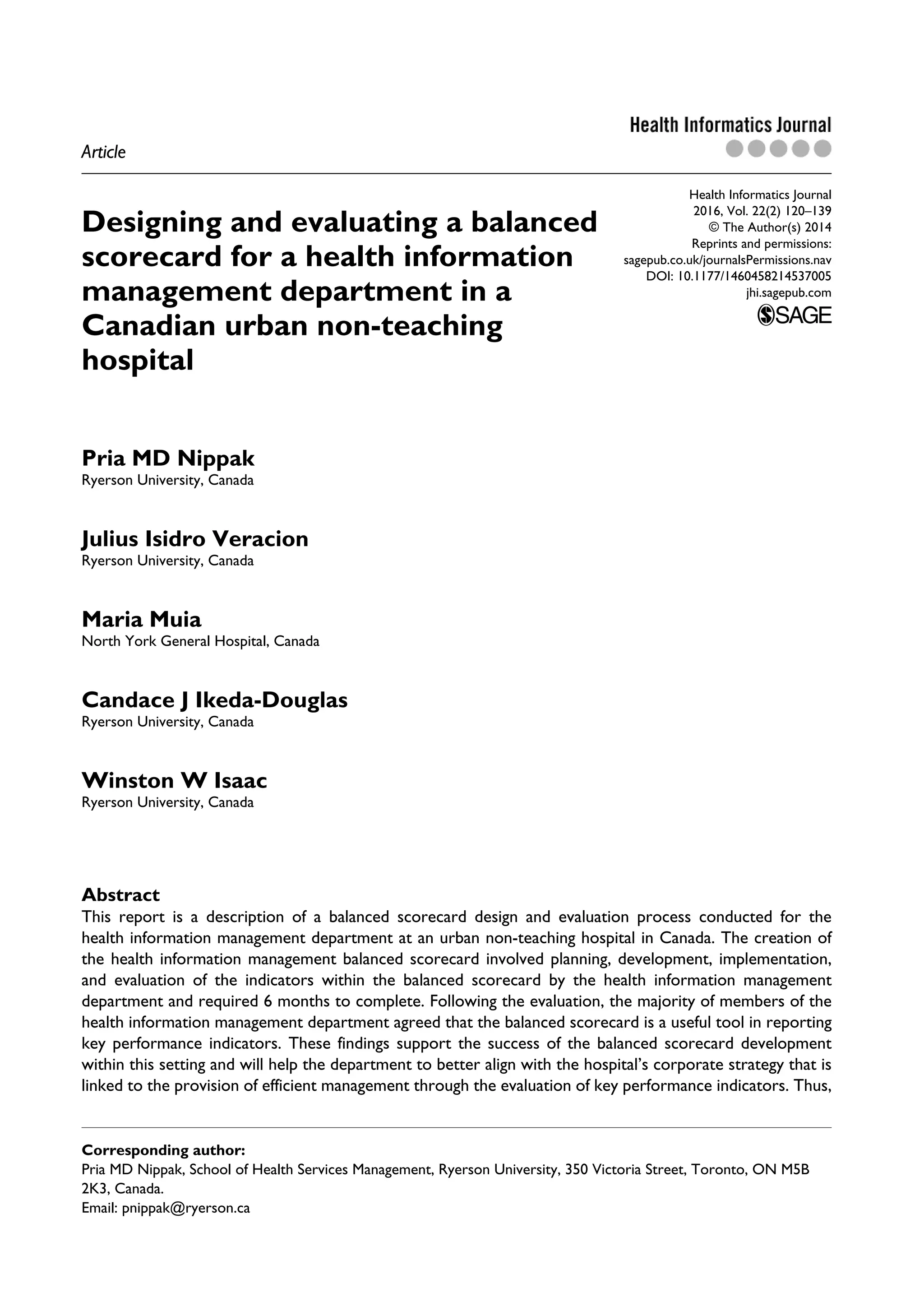 The document summarizes the design and evaluation of a balanced scorecard for the health information management department at a large urban hospital in Canada. The creation of the balanced scorecard involved 6 months of planning, development, implementation, and evaluation. Key steps included aligning the scorecard with the hospital's strategy, identifying relevant metrics, gathering staff input, and conducting an evaluation survey. The majority of health information management staff agreed that the balanced scorecard is a useful reporting and management tool, supporting the success of developing it for the department. The process used to identify metrics can help other health information management departments create their own balanced scorecards.