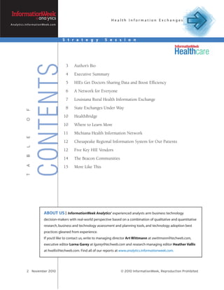 The document profiles four health information exchange (HIE) efforts that are succeeding in getting doctors to share patient data. It discusses how HIEs enable doctors to access test results, diagnoses, and other patient information across organizations. It then summarizes four specific HIE initiatives: the Louisiana Rural Health Information Exchange which serves a rural, underserved region; state-level exchanges being developed in several states using federal funding; HealthBridge serving the Cincinnati area; and the Chesapeake Regional Information System for Our Patients on Maryland's Eastern Shore. The document concludes by noting the growth in HIEs and expectations that new federal incentives and requirements will further drive their adoption.