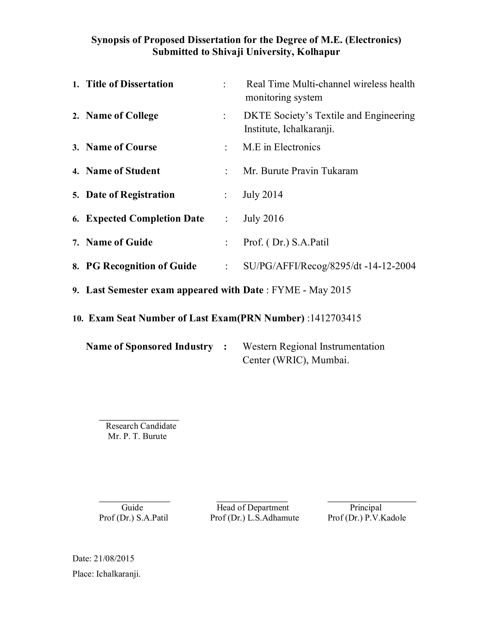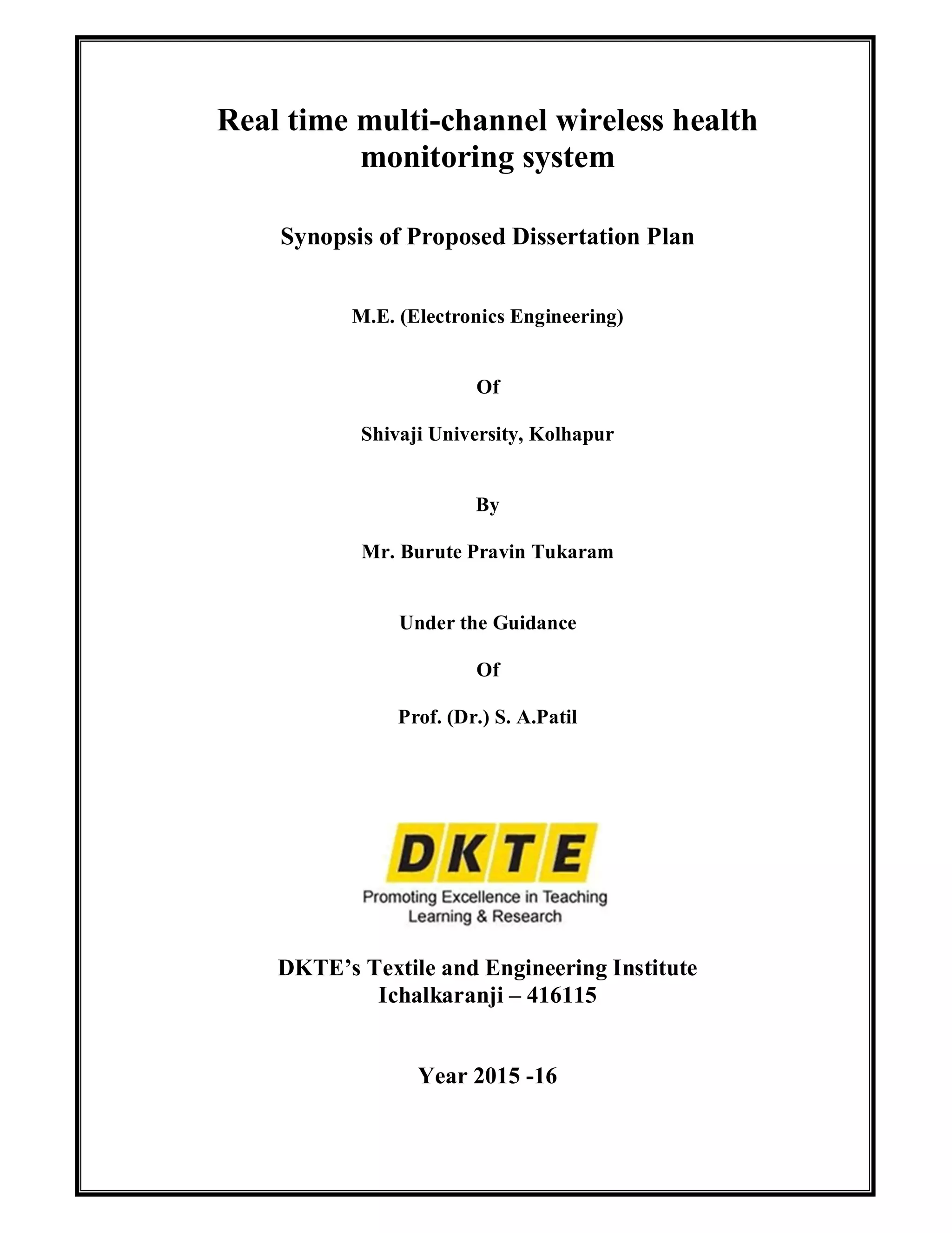 This document provides a synopsis for a proposed dissertation on developing a real-time multi-channel wireless health monitoring system. The system will monitor electrocardiogram (ECG), blood pressure, body temperature, and blood pH from patients. The data will be transmitted wirelessly and viewed by doctors on a computer interface. Doctors will be able to select a patient and view their health parameters in real-time. They will also be able to send a patient's data to specialists for advice when needed. The proposed work will involve collecting sensor data, transmitting it wirelessly, developing processing and display software, and evaluating the system.