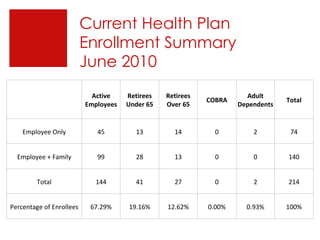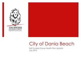 The document provides an overview of the City of Dania Beach self-funded group health plan as of July 2010. It summarizes the current enrollment which is 214 total members, with 67% being active employees. It also reviews the plan experience from October 2008 to September 2009 and October 2009 to June 2010, showing revenue, claims, and net medical claims. Finally, it compares benefits and costs to other local plans and outlines upcoming health care reform changes.