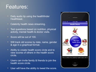 Health Score is a mobile app that provides daily health tips and quizzes sourced from healthfinder.gov to generate a score out of 100 rating a user's health. The app tracks scores over time, allows users to form groups to share scores, and provides resources on nutrition, physical activity, doctor visits, and mental health to help improve scores. Features include daily audio health tips, celebrity news, question hints, graphical score displays, and goal-setting prompts based on quiz results.