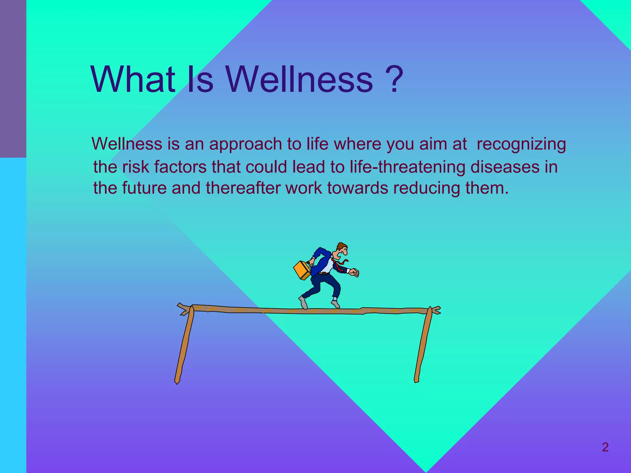The document outlines the concept of wellness, emphasizing the identification and management of health risk factors, such as high blood pressure, diabetes, and obesity, to improve overall health. It provides a comprehensive guide on lifestyle modifications, including exercise, proper nutrition, stress management, and personal organization, to enhance individual and workplace well-being. Additionally, it presents a structured approach to achieving wellness through a 10-step program and highlights the importance of making wellness a lifelong commitment.