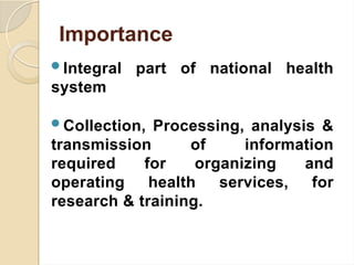 This document provides information on health statistics and vital statistics. It defines key terms like statistics, biostatistics, health statistics, and vital statistics. It discusses the importance and uses of health statistics in measuring health status, quantifying health problems, and planning health services. It describes methods of data collection from experiments, surveys, and records. It also covers data presentation methods like tabulation and diagrams. Sources of health information are also listed. The document then focuses on vital statistics and its uses. It defines vital statistics and describes sources of data for vital statistics like the civil registration system, national sample surveys, and sample registration system. It concludes by covering tools and terms used to measure mortality and fertility rates.