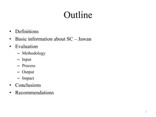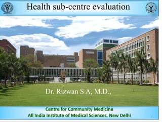The document provides an evaluation of the Jawan health sub-centre in India over a one year period. It summarizes the sub-centre's inputs including infrastructure, equipment, drugs, staffing and funds. It describes the services provided and process of care. Key outputs analyzed include maternal and child health indicators like antenatal care attendance, institutional deliveries, immunization rates, which largely met expectations. The evaluation concludes with recommendations to address gaps in infrastructure, record keeping, quality monitoring and expansion of services.