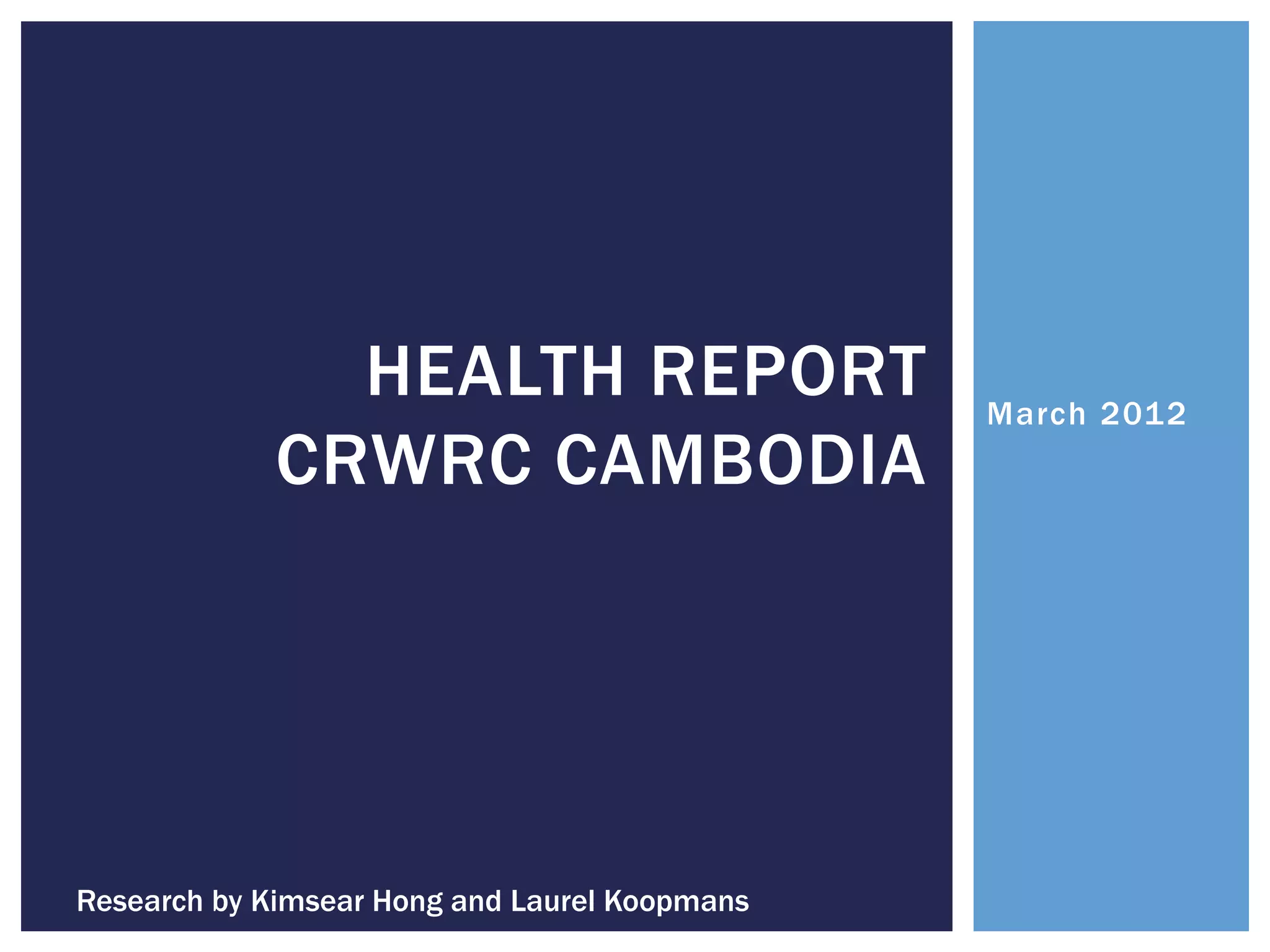 The health survey conducted in Cambodia gathered data from 510 households on topics such as water access, sanitation, household health, maternal health, and child health. Some key findings include: