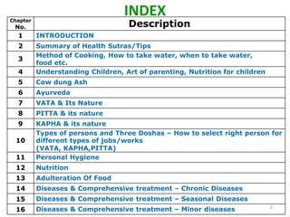 This document provides an introduction to holistic health principles from Ayurveda as described by Maharshi Vagbhata. It discusses how Indian culture and practices were historically suited to the climate but Western influence has led to the adoption of habits detrimental to health. Key tips are summarized, including avoiding processed foods; cooking with air and sunlight; drinking water properly; balancing doshas; and controlling vata, pitta, and kapha. Spreading awareness of these principles through various community channels is also recommended.
