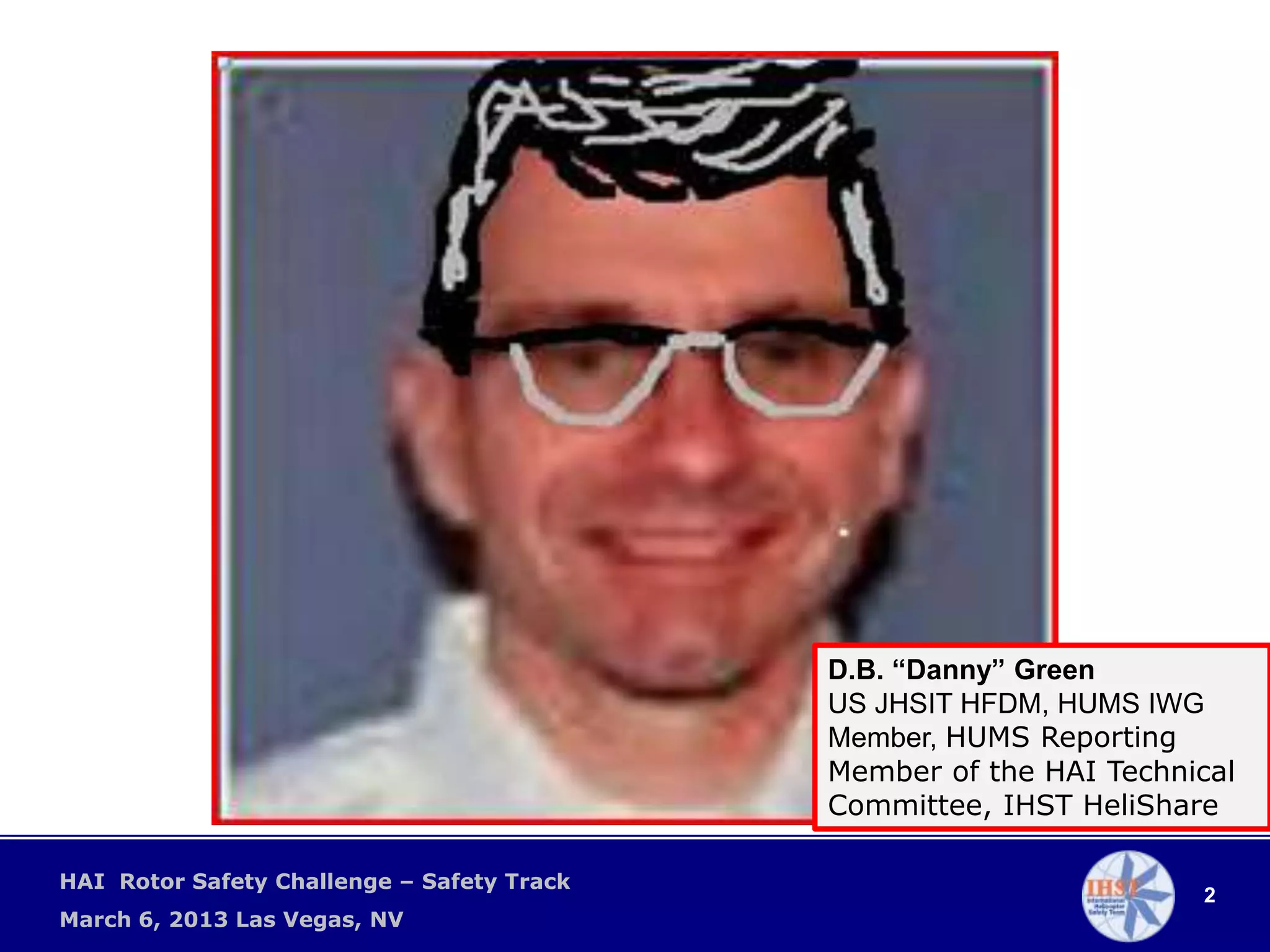 This document provides a summary of a presentation on helicopter health and usage monitoring systems (HUMS). The presentation covers HUMS terminology, benefits of HUMS, common findings from HUMS data, and tools used in HUMS analysis. It also discusses equipment options for HUMS and resources for learning more. The presentation aims to help operators understand how to set up and use HUMS to improve safety and maintenance practices.