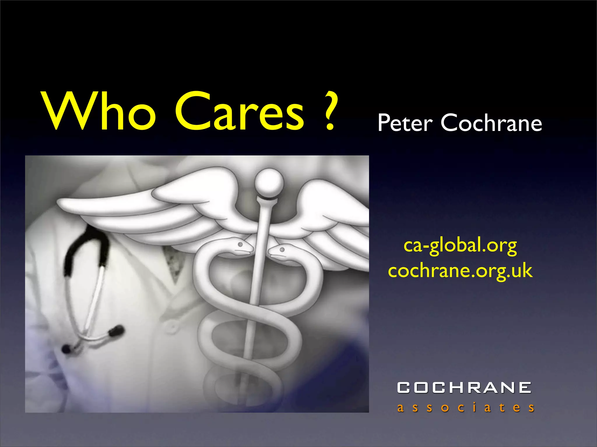 The document discusses emerging technologies and their potential applications in healthcare. It outlines how mobile devices and sensors could be used to remotely monitor health, enable at-home care, and simplify healthcare administration. Implantable devices and distributed medical records stored directly on individuals are presented as future possibilities that could make healthcare more convenient and personalized. The document advocates for simpler solutions over large centralized systems that are prone to limitations and failures.