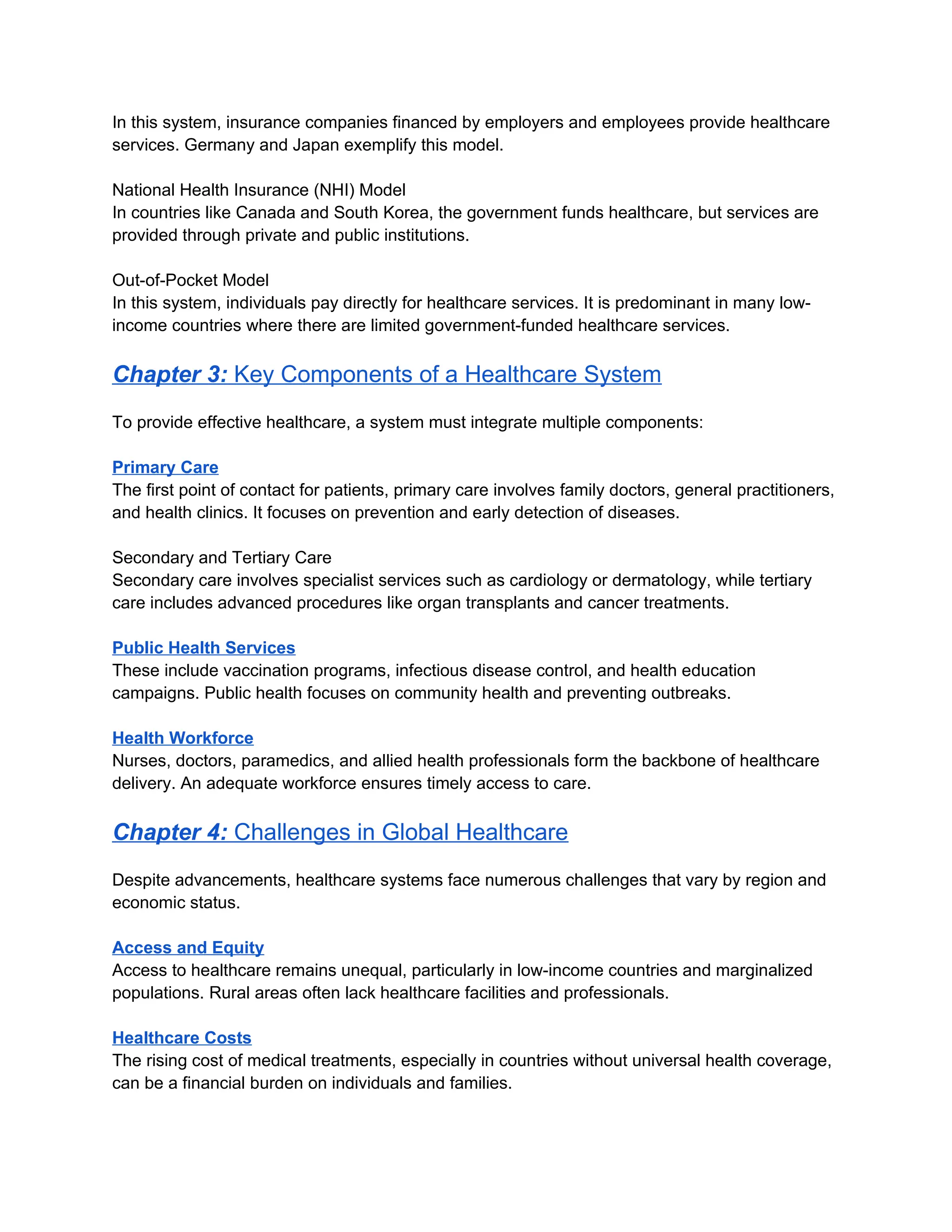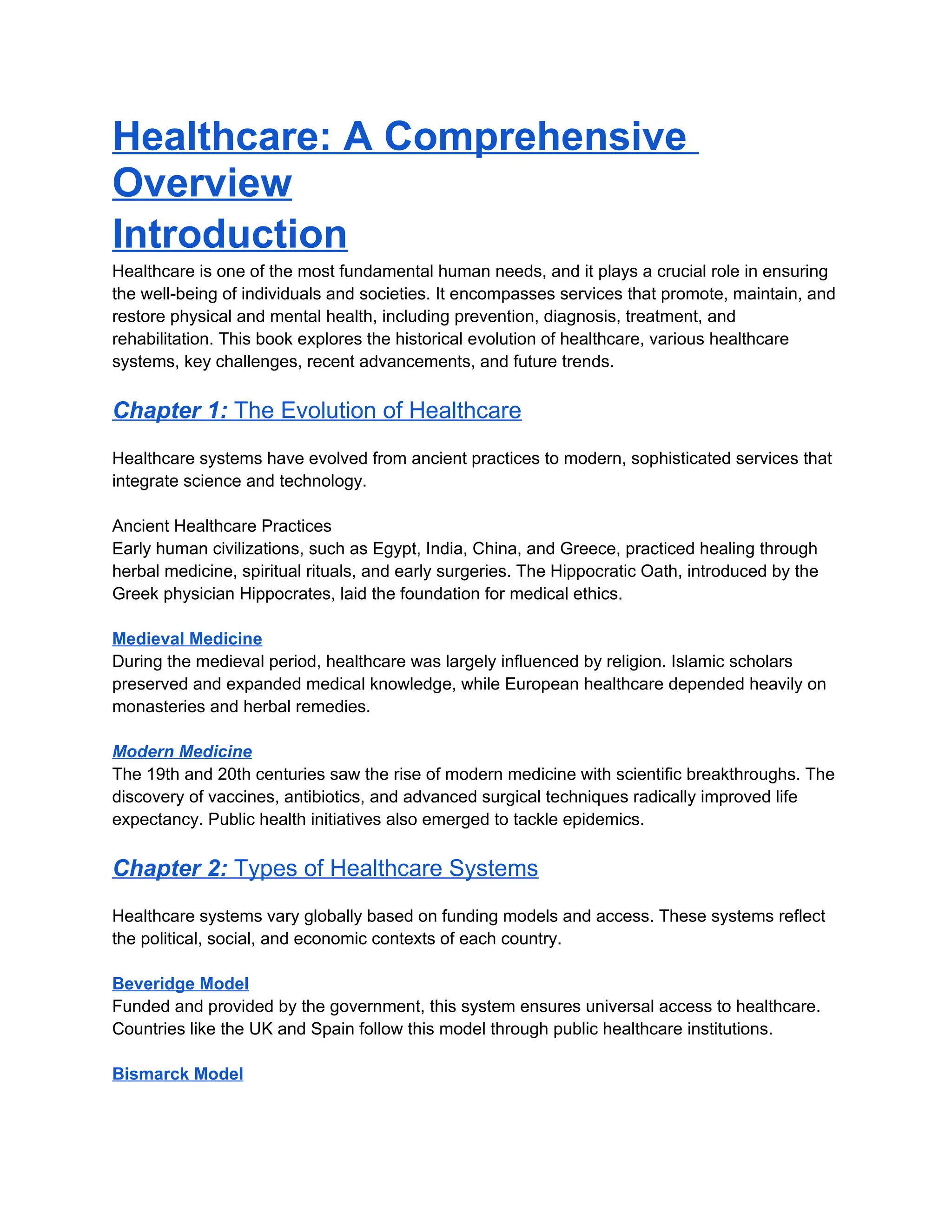 The document provides a comprehensive overview of healthcare, detailing its evolution from ancient practices to modern systems, types of healthcare models, and key components necessary for effective delivery. It discusses challenges such as access inequality, rising costs, and the growing demand for mental health services, alongside the impact of technology and innovation on healthcare delivery. The future of healthcare is framed around preventive and personalized medicine, value-based care, and the effects of climate change, emphasizing the need for equitable healthcare access globally.