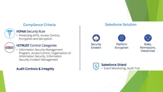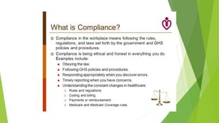 A corporate compliance program identifies risks an organization faces and helps maintain compliance with policies, procedures, laws and regulations. The compliance department monitors for issues, detects problems, and resolves them while advising on prevention. Healthcare compliance provides tools, guidance and education to ensure appropriate reimbursement and prevent violations of acts like the False Claims Act and regulations like HIPAA, HCCA, and GDPR. It is a shared responsibility between software providers and their healthcare customers to securely protect patient data.