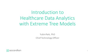This document introduces healthcare data analytics using extreme tree models, authored by Yubin Park, CTO of Accordion Health, which specializes in lowering healthcare costs and improving quality. It discusses the workflow of data analysis, the significance of tree-based models in data mining, and various techniques including boosting and gradient boosting specifically with XGBoost for predicting healthcare outcomes like medication adherence scores. Furthermore, it emphasizes the challenges of messy healthcare data and presents practical examples of model performance and comparisons.