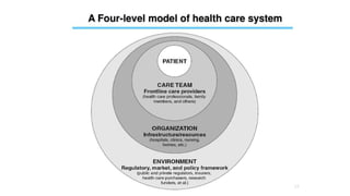 The document discusses key concepts in healthcare operations management. It defines operations management as coordinating processes to deliver quality healthcare services in a cost-effective manner. Core functions include planning, scheduling, purchasing, quality control, and inventory control. Decision areas encompass designing services, managing quality, planning processes and capacity, setting locations and layouts, managing human resources, and scheduling maintenance. Metrics measure performance from financial, customer, and operational perspectives to continuously improve the healthcare system.