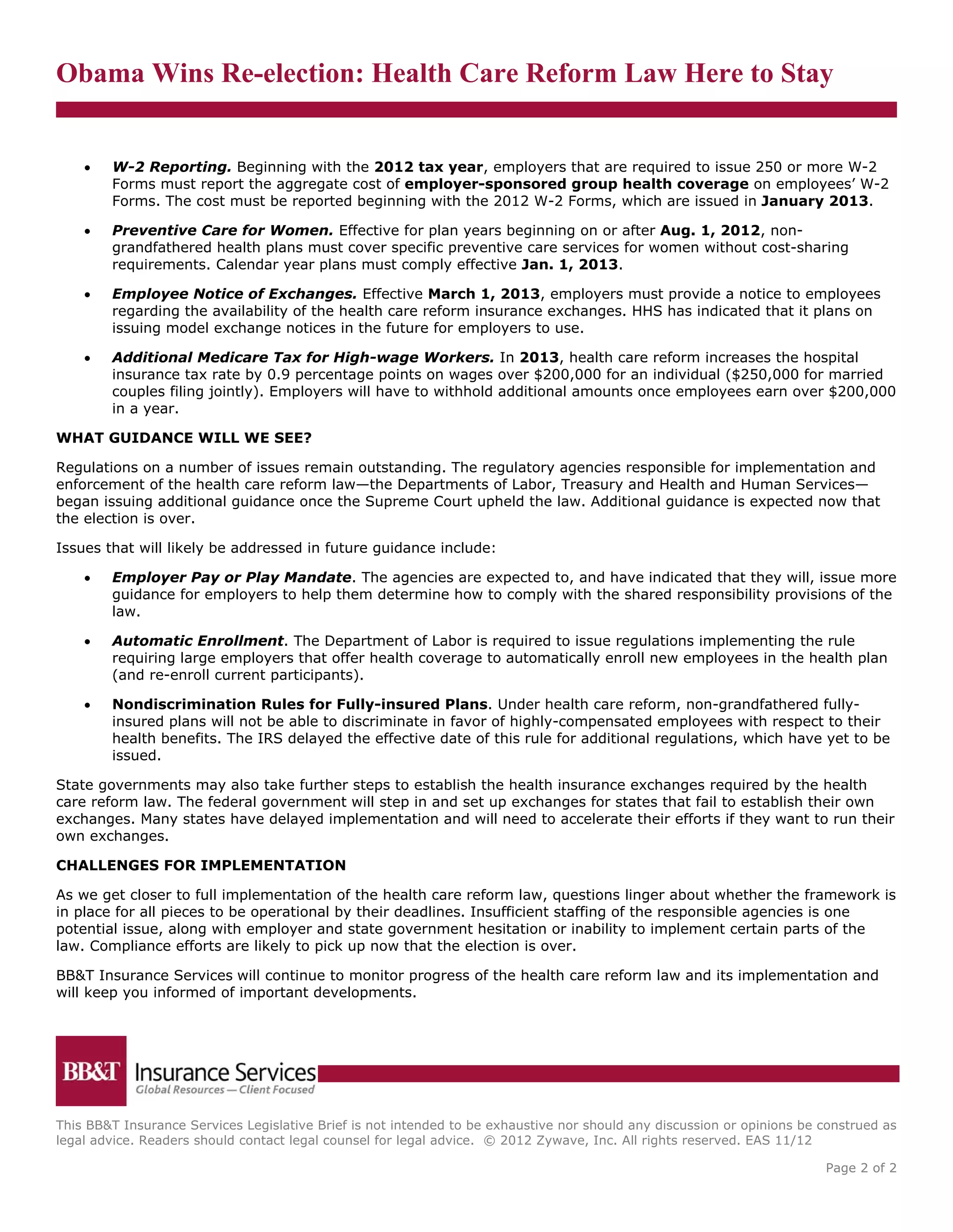President Obama was re-elected, ensuring that the Affordable Care Act will continue to be implemented without further challenges. Employers must prepare for upcoming requirements, such as providing a summary of benefits and coverage and limiting health FSA contributions to $2,500 per year. Additional regulations on issues like the employer mandate and nondiscrimination rules are expected. While implementation of the law will continue, questions remain about whether all parts will be operational by deadlines due to challenges like insufficient agency staffing.