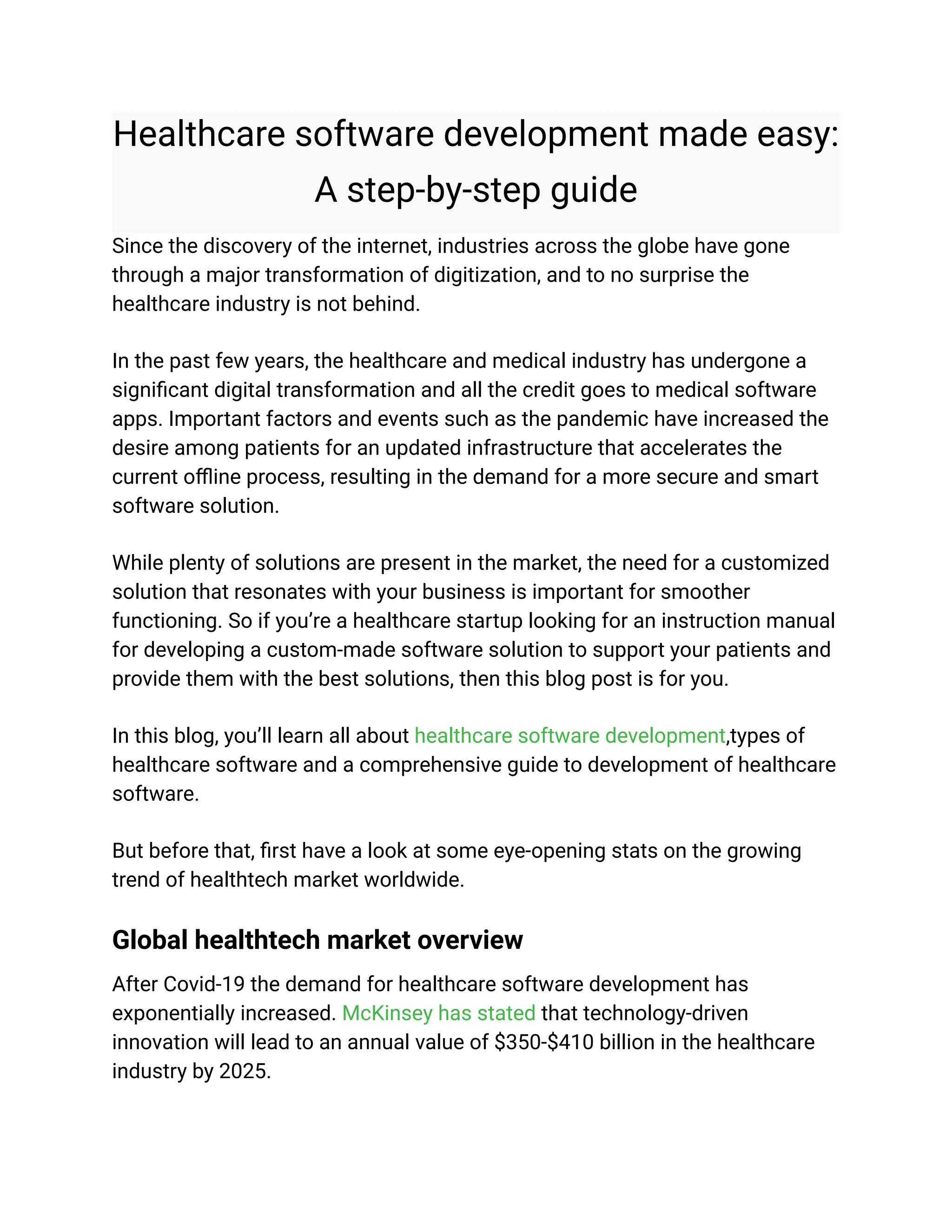 The document is a comprehensive guide on healthcare software development, outlining the digital transformation in the healthcare industry driven by the demand for customized software solutions. It highlights the importance of understanding target audiences, the prototype development process, and key functionalities needed in healthcare applications. Additionally, it presents Peerbits as a capable custom software development firm with a successful track record in the healthcare sector.