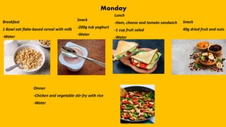 This document provides a sample weekly meal plan for healthy eating for teenagers. It includes breakfast, snacks, lunch, and dinner for each day of the week. The meals consist mostly of whole grains, fruits and vegetables, lean proteins, dairy and water. The goal is to provide balanced nutrition to support a teenager's growth and development through a variety of healthy and nutritious foods each day.