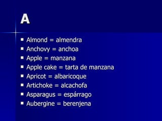 This document provides a healthy dictionary with English to Spanish translations of common food and produce items. It includes translations for over 100 different foods ranging from apples, bananas, and carrots to more complex dishes like lasagna, hamburgers, and Irish coffee. The dictionary is in alphabetical order and provides both the English and Spanish terms for each food item.