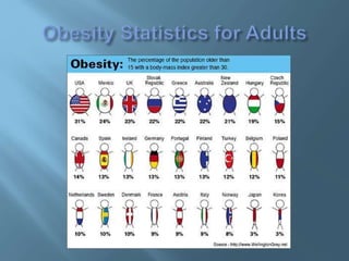 This document provides information about making smart food choices and maintaining a healthy weight. It discusses that a person's weight alone is not indicative of their health, and that factors like height and muscle mass should be considered. It introduces the Body Mass Index (BMI) scale that doctors use to measure obesity levels based on height and weight. The document notes that while weight is a factor of health, muscle weighs more than fat, so two people weighing the same amount may not be equally healthy. It emphasizes exercise and eating the right number of calories based on age as important factors for health.