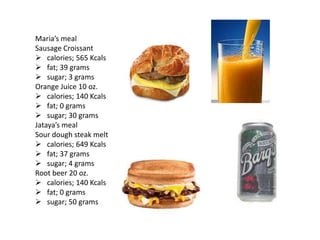 The document compares the calorie, fat, and sugar content of meals from Maria, Jataya, a kid, and an adult to healthier meal options. It finds that Maria's sausage croissant and orange juice have high calorie and sugar contents, while Jataya's sourdough melt and root beer also have significant calories and sugar. The kid's meal has moderate calories but high sugar from the apple slices and drink. The adult meal options range from moderately healthy to high in calories and sugar. In contrast, the healthy meal options generally have lower calorie, fat, and sugar contents.