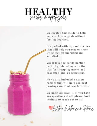 The document provides healthy snacking strategies and tips. It includes snack swaps to satisfy cravings while staying on track with nutrition goals. Various snack recipes and portion guidelines are also presented to help nourish the body with balanced snacks throughout the day.